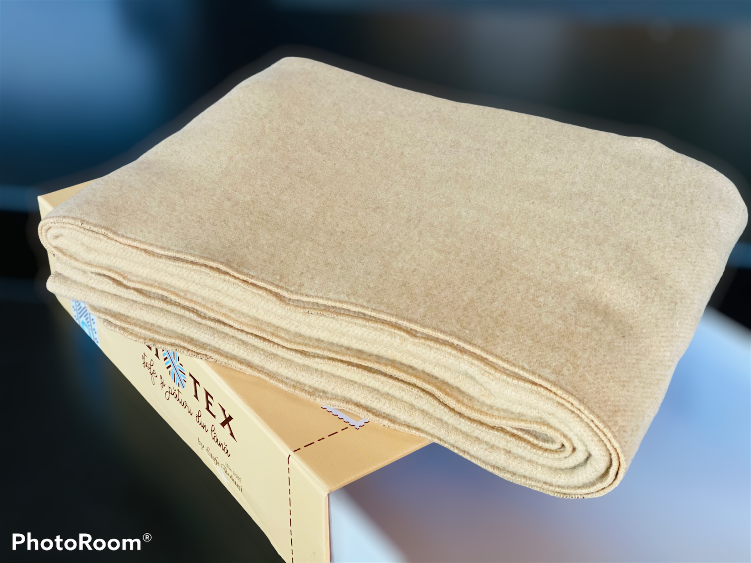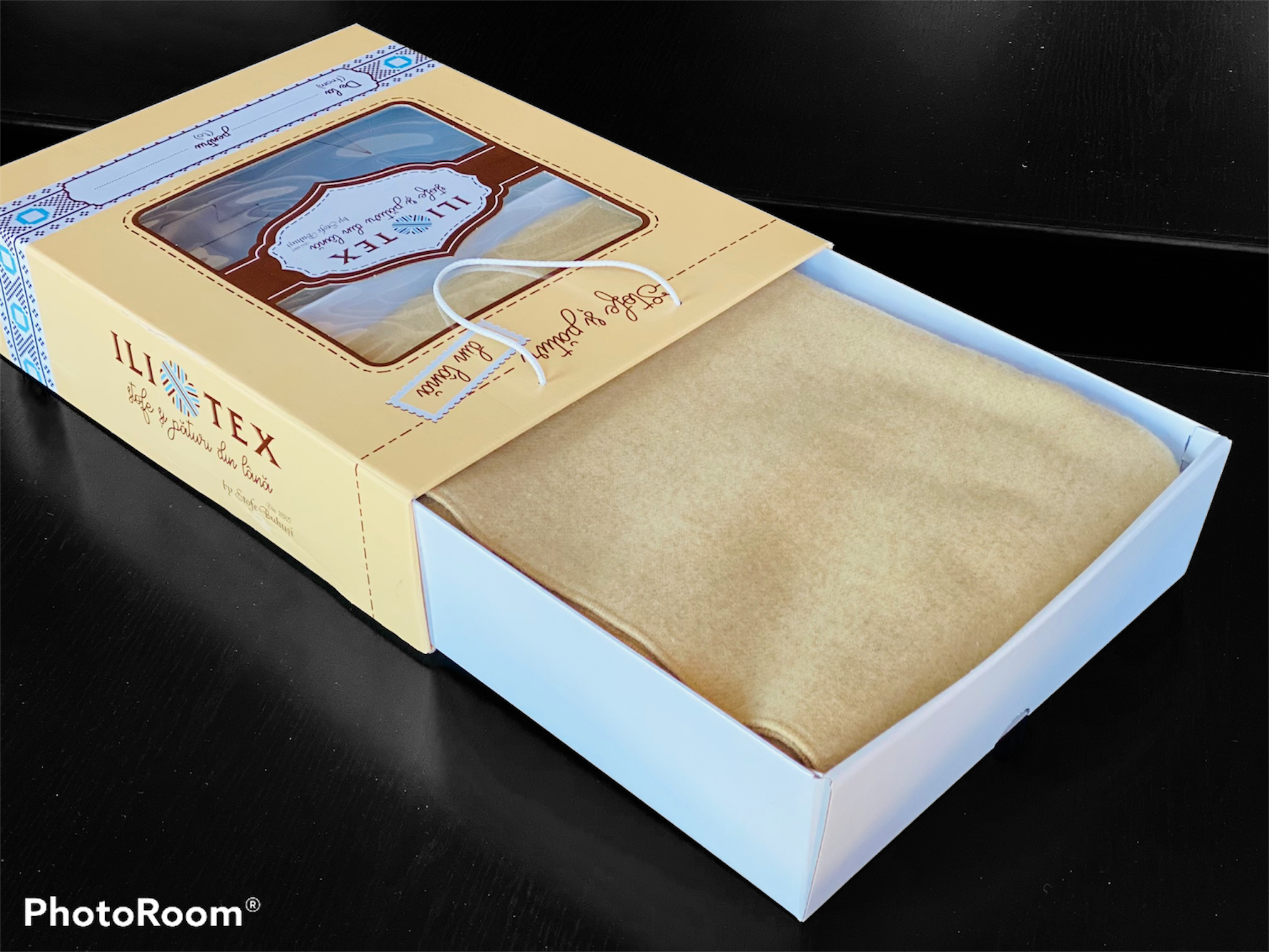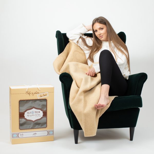 Pătură lână merinos, model IOANA-v2, 150x220cm, bej, 707 gr/mp, margine surfilata, cutie premium